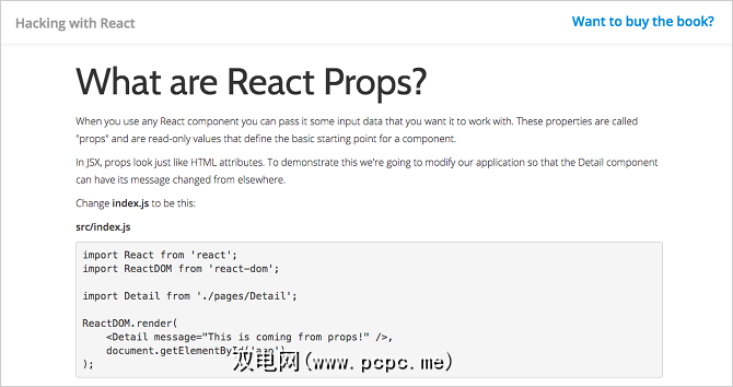 使用React入侵是一本完全免费的电子书,如果您阅读了仅适用于网络的版本,这本书将涵盖所有内容。如果您想随身携带它并离线学习,可以10美元的价格获取该文件的可下载PDF,EPUB或MOBI版本。无论哪种方式,对于不喜欢视频的初学者来说,这都是一个很棒的资源。