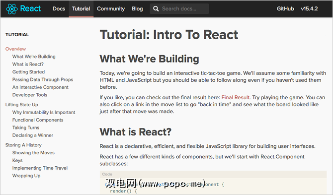 话虽如此,一旦您了解了React和Java的核心概念,官方的React教程就是很棒的选择。正在努力将它们付诸实践。它带领您完成一个井字游戏Web应用程序的创建,仅使用组件,道具和状态。它弥合了抽象理论和实际应用之间的鸿沟。