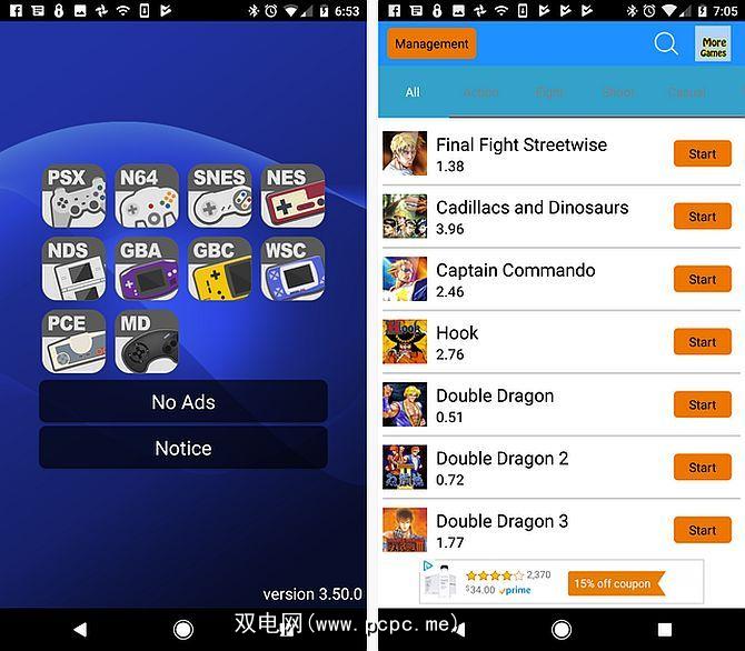 这个模拟器是我在此列表中的首选,并不是因为用户界面(尽管它位置合理)且舒适),但主要是因为可以仅使用Android手机在众多游戏机上玩游戏。