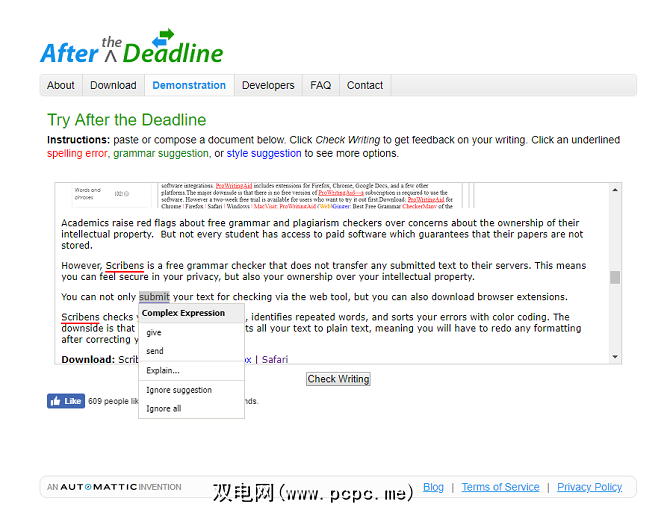 如果您正在专门寻找开源语法检查器,则“截止时间之后"(也称为 Polishmywriting.com )是许多人的首选。该工具由WordPress.com背后的同一家公司Automattic开发,具有许多其他免费语法检查程序无法吸引的信任度。