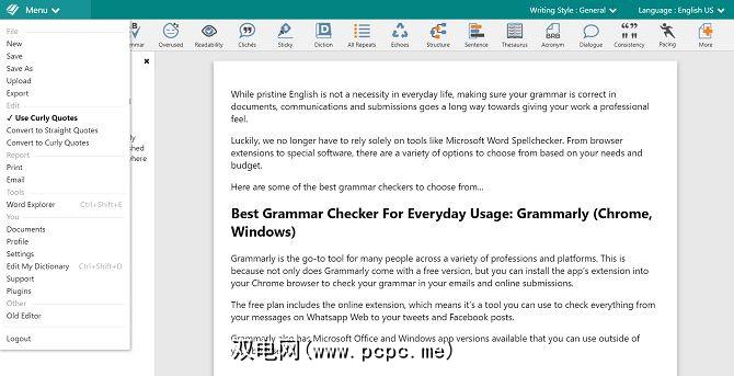 ProWritingAid对于作家和专业人员而言是一个不错的选择,因为它不仅可以检查语法结构。实际上,该应用程序还会检查您的写作是否有冗余,重复,陈词滥调和其他写作错误。