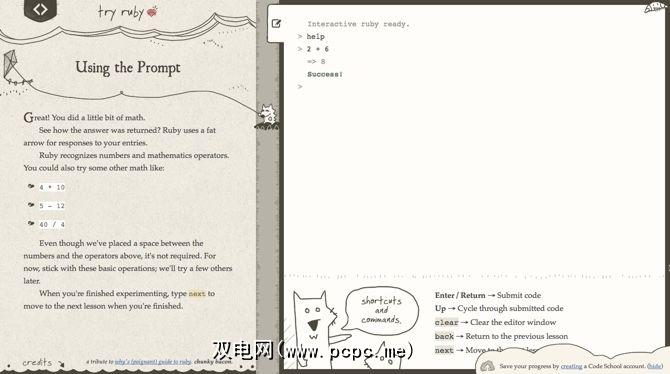 尝试Ruby是CodeSchool提供的一个简单的交互式代码沙箱,可以为您提供帮助将脚趾浸入语言。本教程将教您该语言的绝对基本构建块(包括数字,字符串,属性和方法)。您只需键入“ 2 + 6"之类的简单内容,即可了解Ruby如何处理数学运算符。