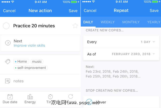 视角使您仅看到工作,个人或其他任何类别的任务。多种视图选项在细节上有所缩小。这里有大量的可定制性,并且具有巨大的功能。要花点时间才能掌握,但可能没有更好的应用可以用GTD管理您的整个生活。