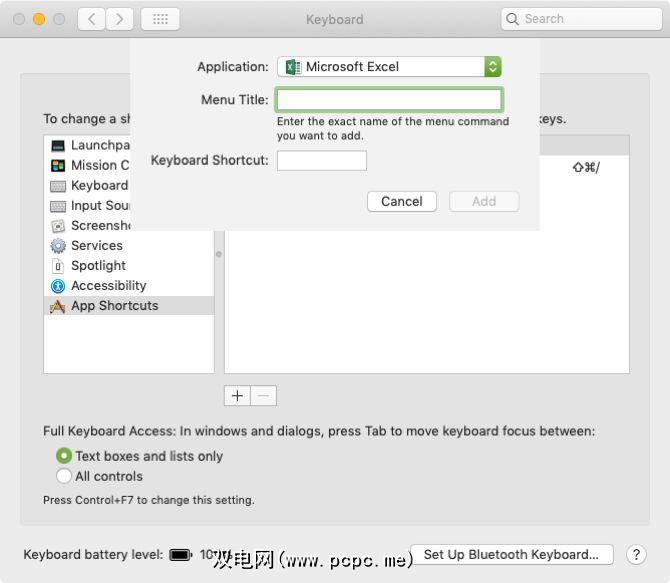 许多选择将键盘快捷方式添加到其Mac并将其应用于特定的应用程序,这可以如果没有冲突,请仅完成。您可以转到系统偏好设置>键盘>快捷方式>应用程序快捷方式来执行此操作。然后,您单击加号,选择您的应用程序,输入菜单命令,并包括快捷方式。