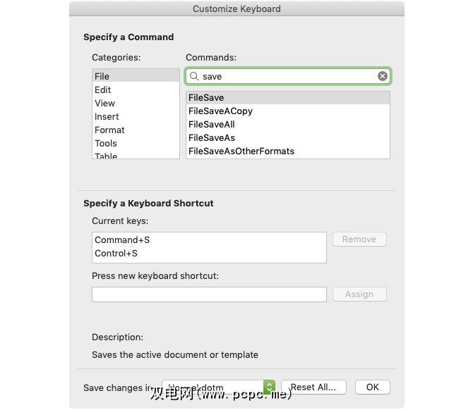 要删除它,只需选择它,然后单击删除。要添加新的快捷方式,请在按新的键盘快捷方式部分中输入所需的键。您可以决定将更改保存在当前文档或Word文档模板中。然后按确定。