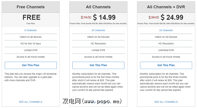 提供三种价格计划。入门级免费软件包包括六个频道,其中一些频道(ABC,FOX和PBS)显示新闻。每月19美元的常规计划增加了FOX新闻。最昂贵的月费$ 29 /套餐不增加任何频道,而是使您可以使用DVR功能。