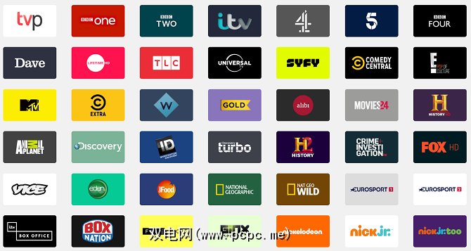 您将可以访问BBC One,BBC 2,ITV,第四频道,第五频道,Dave,More4, CBBC,BBC新闻,美食网,时尚电视,旅游频道等。
