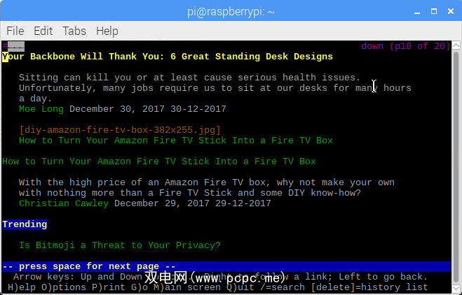 sudo apt install lynx要使用该浏览器,请打开终端并输入lynx,然后输入URL 。因此,要查看PCPC.me的用法,请执行以下操作: