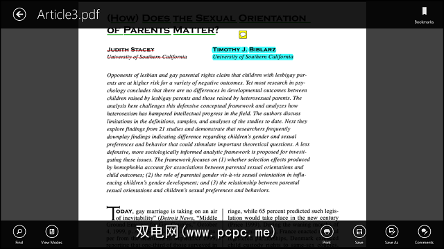 如您在上面所看到的,有一些熟悉的搜索和查看模式以及打印和保存选项。此处的另一个按钮是评论,我们将在稍后讨论。在顶部,您会看到没有选项卡式浏览,因此打开另一个PDF文件需要退出并选择另一个文件。如果您的PDF内置了书签,则右上角的“书签"按钮将很方便,但是无法从应用程序内插入书签。