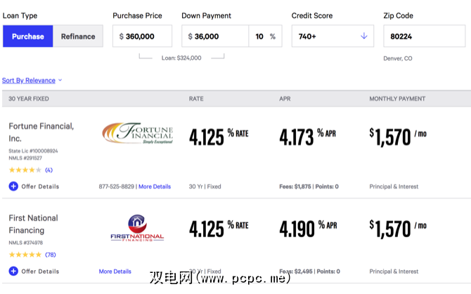 当然,全国各地的抵押贷款利率都不一样。要查找您所在地区的抵押贷款利率示例,请访问Bankrate的抵押贷款页面。在这里,您需要输入要购买的房屋的价格,定金,信用评分和邮政编码。
