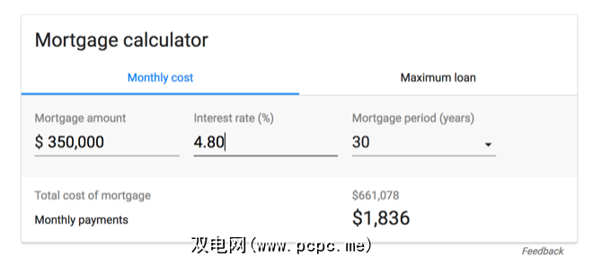 肯定有一些简单的抵押贷款计算器-Google甚至在其结果页面中内置了一个抵押贷款计算器: