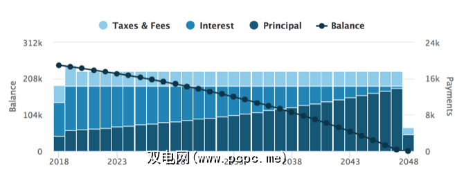 此视图向您显示您每年支付的金额,并将该金额细分为税款,费用,利息和价格关键的如您所见,贷款的前几年主要用于偿还利息,而稍后您又开始在本金上做大笔缩。