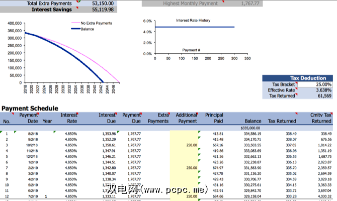 有了它,您将获得完整的摊销表,该表告诉您每月要还多少钱,何时还清贷款以及总金额支付的利息,如果您每两周支付一次,而不是每月支付,您将节省的金额,等等。