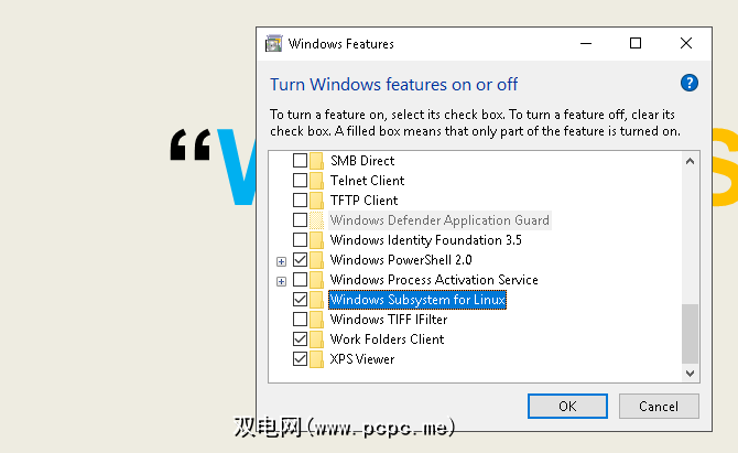 要在Windows上安装Ubuntu,请单击开始菜单,然后输入 Windows功能。然后点击打开或关闭Windows功能选项。在以下窗口中,找到并检查 Linux的Windows子系统选项。
