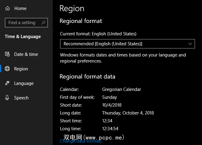Windows 10根据您所在的地区设置一些显示选项,例如日期格式和一周中的第一天。现在,您可以根据需要覆盖它们。访问设置>时间和语言>区域,然后单击更改数据格式进行调整。