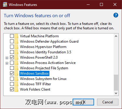完成后,键入 Windows功能进入“开始"菜单,然后打开打开或关闭Windows功能链接。在结果列表中,找到 Windows沙箱,选中它,然后按确定。您将看到一个新对话框,该对话框将安装一些必要的文件,然后提示您重新启动以完成安装。