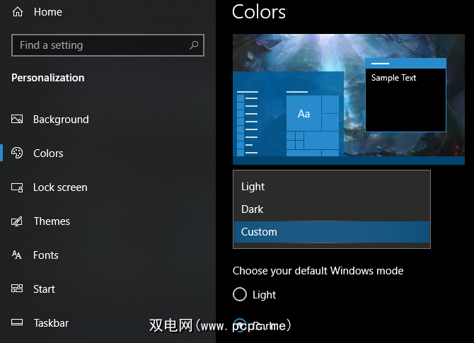 要启用它,请转到设置>个性化>颜色。在选择颜色下,可以选择新的浅色主题,深色或自定义。如果选择自定义,则可以为Windows模式和应用程序模式设置单独的选项。这样一来,您就可以将Windows元素设置为黑暗,而使应用程序处于亮模式,反之亦然。