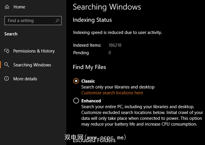 在这里,您可以选择新的增强搜索模式。在此之前,Windows 10只会搜索您经常存储文件的文件库和桌面。但是,如果选择此选项,则Windows搜索将查看整个PC。如果您不将文件保存在库中或只是想搜索所有内容,这是一个方便的选择。