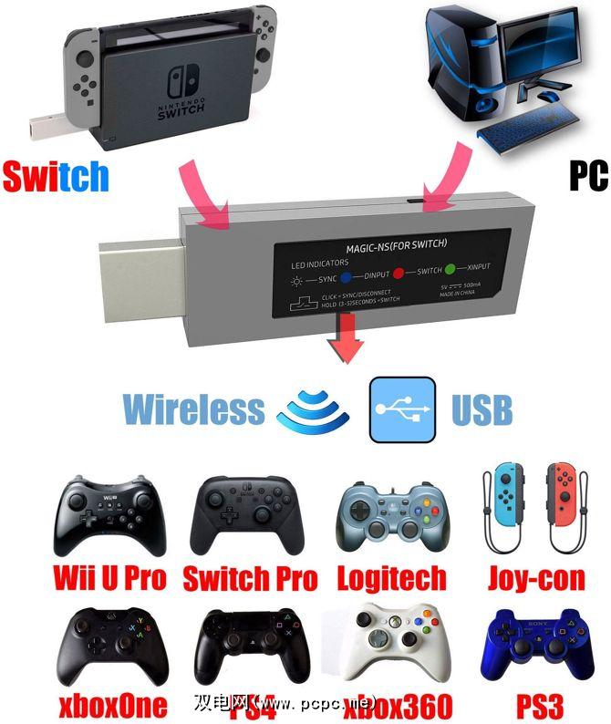 Mayflash Magic-NS无线控制器适配器允许已启用蓝牙的控制器与Nintendo Switch之间进行无线连接。它还与Xbox One S控制器,Wii U Pro控制器和Playstation DualShock 3 / 4s兼容。它还提供了与Xbox 360控制器和Logitech 510等有线游戏手柄的兼容性。