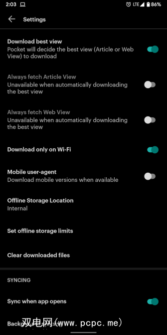 使用Pocket,您可以存储有空的文章。将网页添加到Pocket列表后,该应用程序会自动将其下载到手机上。它提供了一套全面的设置,以防您想调整它可以使用的数据量。