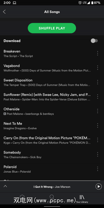 如果您是高级订户,Spotify允许您保存您的音乐库以供离线收听(最多10,000首曲目)。您也可以选择下载单个播放列表或专辑,无论这些歌曲是否在您的收藏中。它位于任何播放列表的三点菜单下。