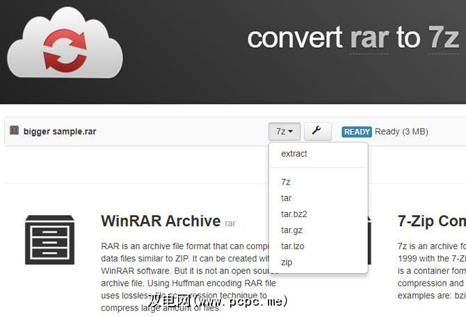 CloudConvert是一个著名的工具,它使您几乎可以将任何文件类型转换为另一个文件类型。将一个RAR存档上传到其中,然后CloudConvert将允许您提取内容并将其转换为7Z,TAR和ZIP格式。不幸的是,提取过程仅支持以ZIP文件下载。