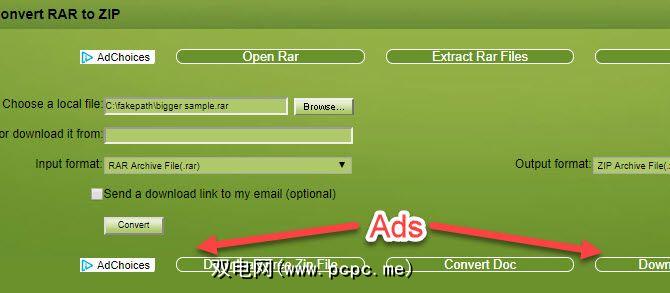 该工具允许您将RAR存档转换为其他格式,例如ZIP,TAR和7Z。但是,它有几个缺点。该页面加载了广告,包括视频广告,文件转换时的重叠式广告以及看起来像合法按钮的广告链接。