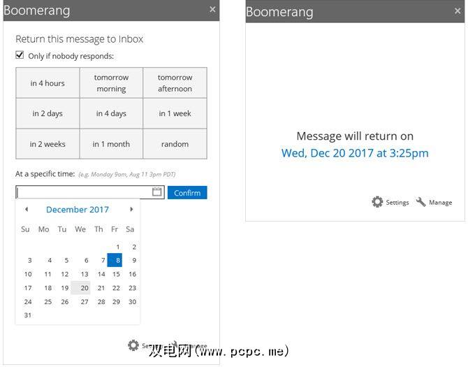 另一个很棒的功能是灵活的提醒。您可以在指定的日期和时间,随机地或仅当没有人响应时,才将邮件返回到收件箱。这是确保您永远不会忘记后续活动的好方法。只需单击收件箱中工具栏中的打开Boomerang 按钮,然后选择电子邮件,或在消息窗口中单击提醒我。