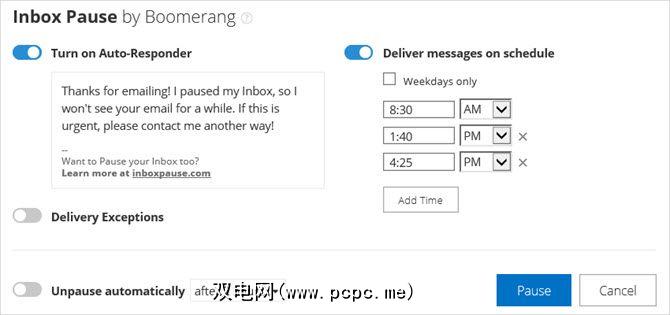 You can set up an automatic response, configure delivery exceptions, or schedule messages for certain days and times. You can also check out the option to Unpause automatically if you are worried you may forget to turn it off. All of these options are displayed when you click Inbox Pause from your toolbar.