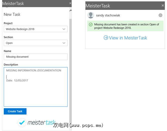 如果MeisterTask是您选择的工具,那么也有一个Outlook加载项。与Trello工具的工作方式类似,您可以从收件箱或消息窗口将任务快速添加到MeisterTask。单击工具栏中的按钮,然后从侧面窗口中选择项目和部分。主题行变成任务名称,消息正文变成描述,每个描述都可以编辑。