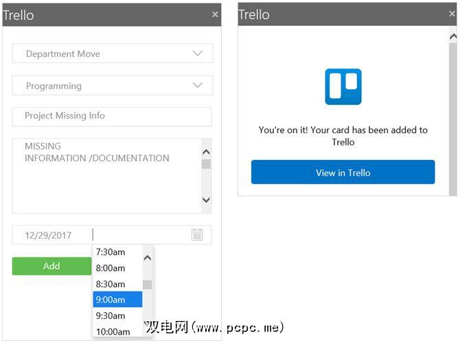 小窗口打开时在右侧,选择您的板子和列表。电子邮件主题将显示为卡名,消息正文将作为说明。但是,您可以编辑两个字段。您还可以选择截止日期和时间。完成后,点击添加。然后,您可以选择在Trello中查看卡,该卡将显示在弹出窗口中。或者,您也可以直接关闭加载项。