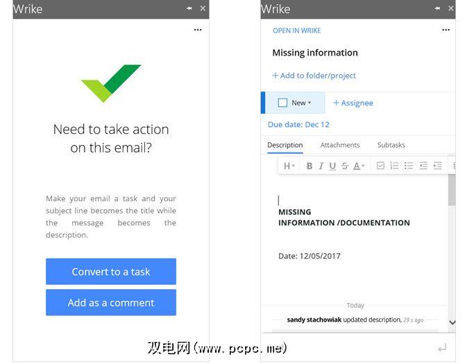 Wrike是最后一个基于Web的项目管理工具,具有Outlook的强大附加功能。这样,您可以将电子邮件转换为任务或将其添加为评论,这非常方便。如果选择转换为任务,您将看到主题行作为名称,正文作为描述,就像上面的加载项一样。但是,这为您提供了更多选择。您可以标记状态,将其分配给团队成员,安排其时间,添加附件并插入子任务。