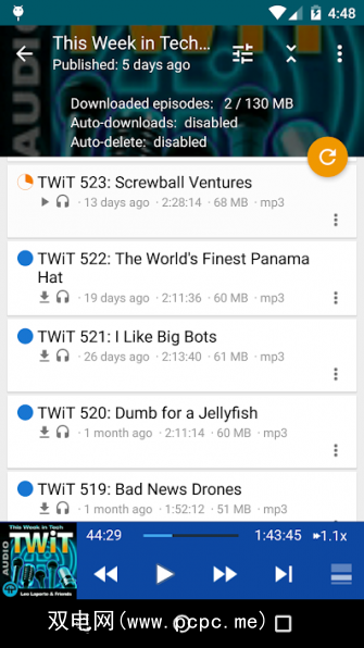 该应用是目前功能最强大的播客播放器之一。它具有音频效果,能够在您睡眠时安排下载时间,即时插播流支持,Android,iOS和Web应用程序之间的自动插播同步以及多种存储选项。它还可以将剧集直接从设备流式传输到Chromecast,并且与Android Auto兼容。