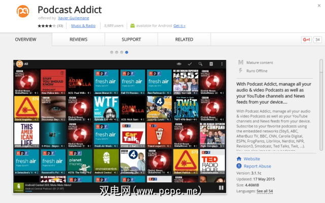 Podcast Addict是一个非常受欢迎的Android Podcasting应用,截至2014年底,它也已在Chrome Web Store上提供。