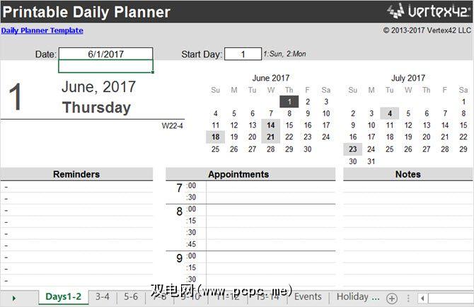 如果您在忙碌的日子里有很多约会,则可能一次需要一个计划者。 Vertex42提供了一个模板,可以按小时细分,并且以15分钟为增量来细分您的一天。该工作簿包含九个选项卡,其中一个用于事件,另一个用于假期。每日计划者在其他选项卡上,并且在一张纸上包括两天。