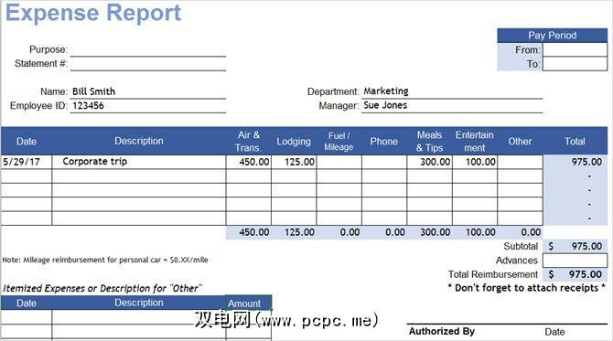 当需要上缴业务费用以进行报销时,请确保将所有费用汇总在一起。 Vertex42的费用报告模板包含您需要跟踪的所有内容。您可以在运输,住宿和餐饮等项目的类别中输入金额。然后,所有数据都会自动为您计算。