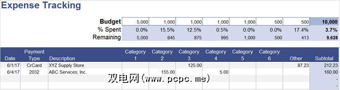 如果您正在寻找费用跟踪器以掌握财务状况,Vertex42的此有用模板将为您提供便利内置计算。在顶部弹出预算,并根据需要为每个类别输入不同的金额。输入美元金额后,您可以快速查看已花费金额和剩余金额的百分比。