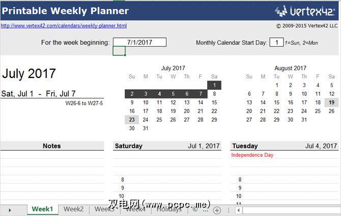 使用Vertex42的每周计划模板来计划每月的每个星期。下载工作簿时,您会看到五个选项卡:一个选项卡用于每月的每个星期,第五个选项卡用于假期。您可以在小时旁边键入事件,或者如果您希望手动记下项目,则可以打印计划器。