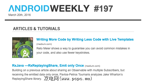 为什么会喜欢它: Android Weekly是其中之一您会发现最密集的编程新闻通讯。每期杂志都包含了惊人的信息,包括但不限于文章,教程,库,项目,视频,播客和工作清单。质量和质量都是如此。