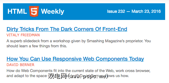 为什么会喜欢它:与HTML5技术相关的所有事物,包括CSS3,Canvas,WebSockets,WebGL,Native Client等主题。每个新闻通讯都包含有关新发展的新闻,重要的提示和技巧,甚至您可以申请的一些职位空缺。