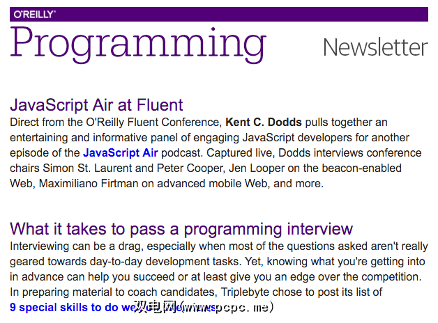 为什么会喜欢它:谁都不知道,O'Reilly是一家媒体发行商,管理着许多编程材料,包括许多免费的编程书籍。这是一本通用新闻通讯,涵盖诸如“ Netflix如何编写代码"或“如何通过编码采访"之类的更高级别的主题。对于有抱负的编码人员而言,它绝对比老牌老手有用。