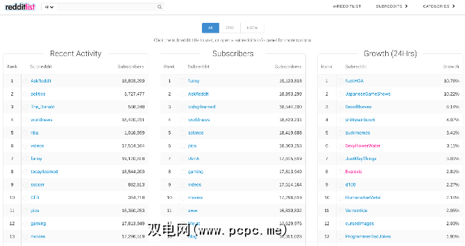 RedditList是定期更新的前5,000个子目录的列表。这些都按照是否为NSFW进行了整齐的排序,并按照幽默,科学,电影,文化,游戏等类别进行了排序。