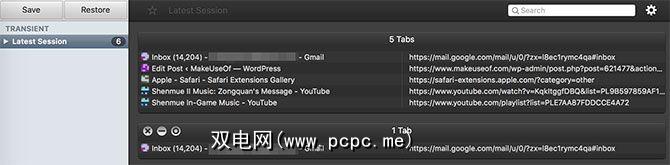 在工具栏中单击“会话"按钮可将整个选项卡集另存为单独的会话,并还原其他选项卡随时。简单。不幸的是,Sessions是最新版本。现在仍然可以使用,但是将来的Safari更新势必会在某个时候中断它。