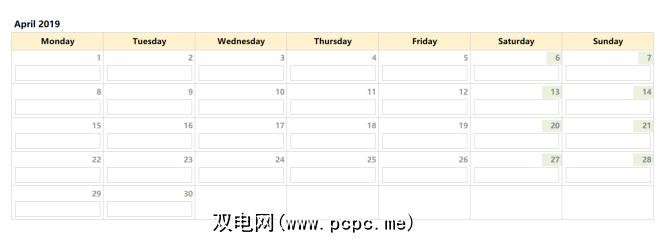 它在列的每一天中都为一个空白单元格(单元格数没有限制)。您可以在此日历中添加带有复选框的标签并管理正在运行的待办事项列表。
