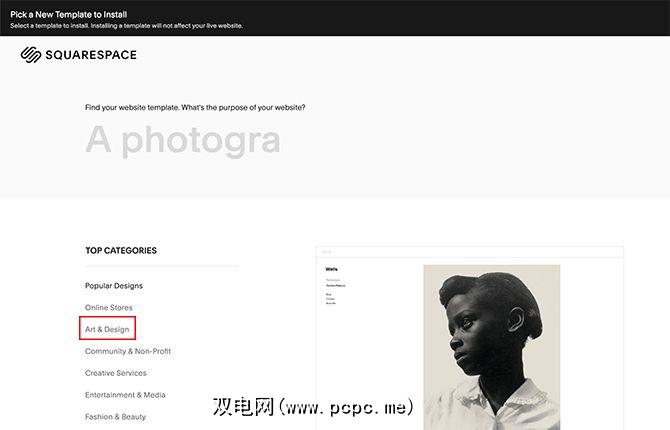 要缩小搜索范围,请登录您的帐户,点击您网站的图标,然后点击设计>模板>安装新模板。这将带您进入Squarespace的主模板页面,您可以在其中单击 Art&Design 类别。这样,您就可以将模板选项缩减为可管理的少数几个。
