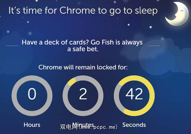 您的孩子将在剩余一分钟的时间弹出一个简短的通知。当Goodnight Chrome启动时,您孩子尝试访问的任何网站都会显示一条漂亮的小消息。