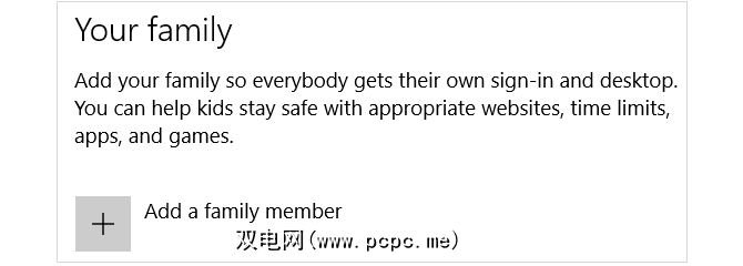 在Windows计算机上,请确保已将孩子添加到家庭设置中。为此,请打开您的设置,选择帐户,选择家人和其他人,然后点击添加家人 >。您必须登录到Microsoft帐户才能使用此功能,或者可以查看Joel Lee的这篇有用的文章,其中介绍了如何限制所有用户帐户的时间。