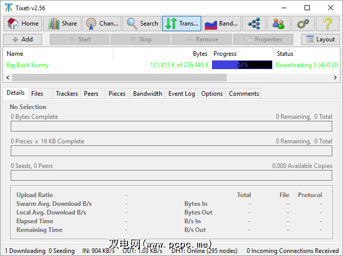 您可以在不同的界面之间进行切换,包括传输,带宽或DHT(如下图所示)。 [首页]标签会显示Tixati的日志文件以及所有传输和传入连接的摘要。像qBittorrent一样,Tixati带有内部搜索引擎,可让您避免潜在的种子网站。