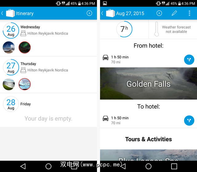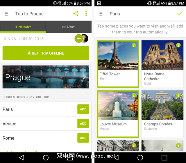 Tripomatic在图片上很繁琐,因此,它是一个非常漂亮的应用程序。如您在下面看到的,它以风景如画的风景和标志性地标填充了背景。您添加到日常行程中的任何旅游景点也都由大照片来表示。