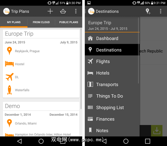 myTrip的设计可以追溯到Ice Cream Sandwich的时代,但这是一个功能强大的应用。您从左侧向内轻扫以访问所有不同的子菜单,并且所有内容都显示在灰色背景上方的简单白卡上。